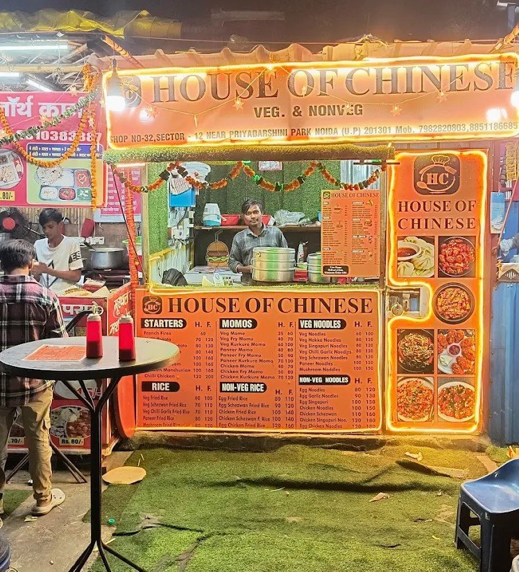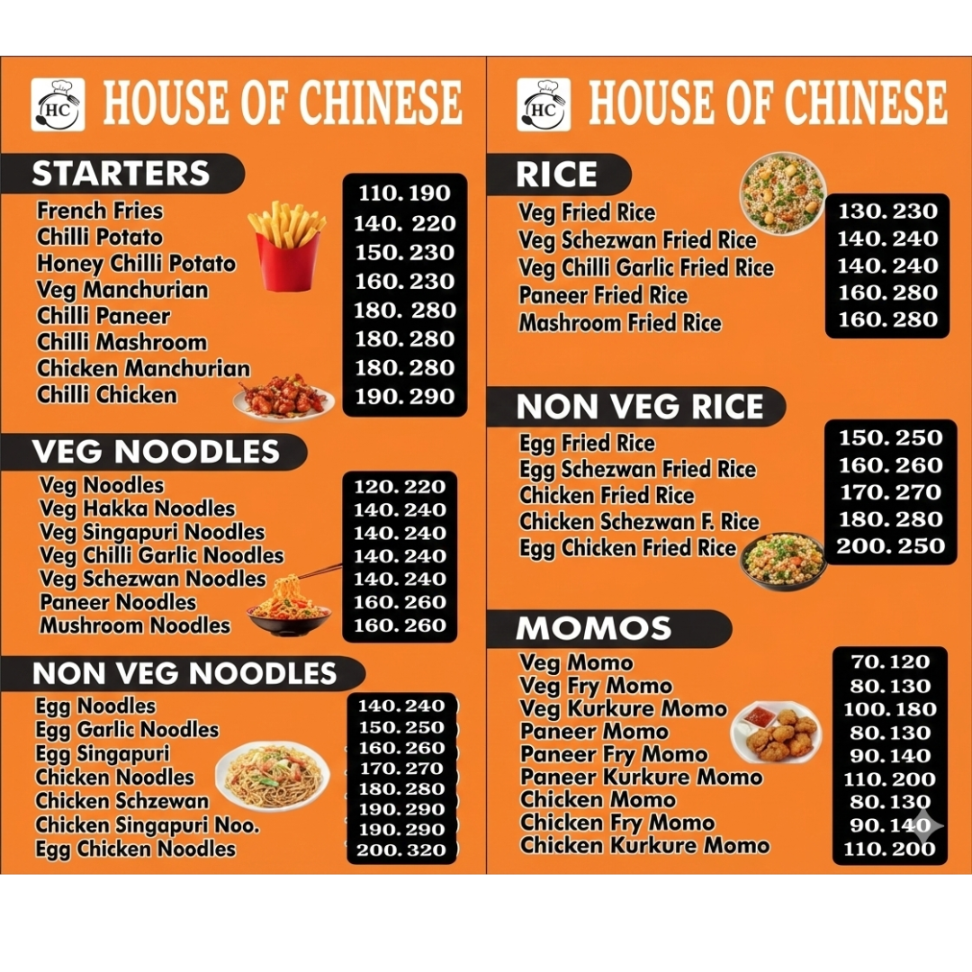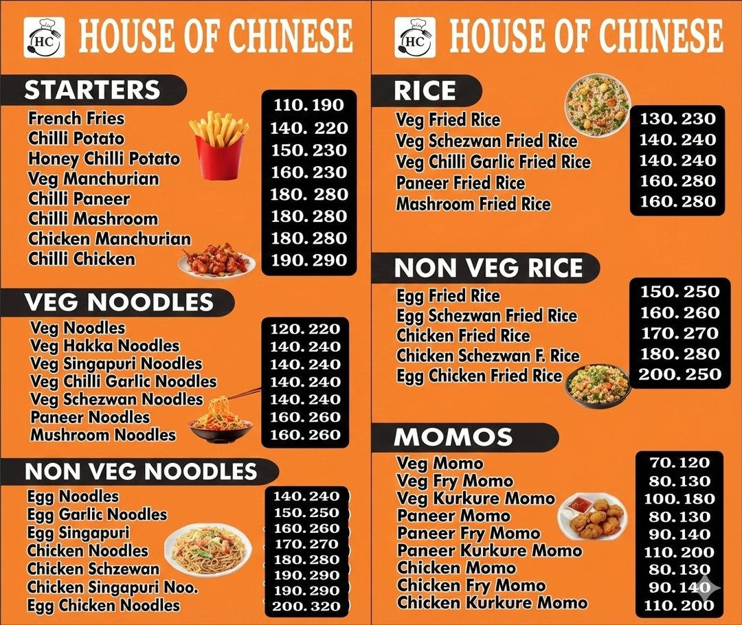 House of Chinese offers a tasty variety of Chinese food including starters, veg and non-veg noodles, fried rice, and momos. The menu features popular items like Manchurian, Chilli Paneer, Schezwan Noodles, Fried Rice, and different types of veg, paneer, and chicken momos, all available at affordable prices.